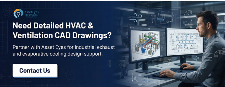 At Asset Eyes, we deliver high performance evaporative cooling system design backed by expert CAD drafting service and precise CAD drawing services. Our team specializes in HVAC equipment design, HVAC CAD drafting, and industrial ventilation system design, ensuring cooling systems are efficient, reliable, and easy to implement. Every design is developed with accurate airflow planning, proper equipment placement, and seamless integration with industrial exhaust system design to improve indoor air quality and energy efficiency.